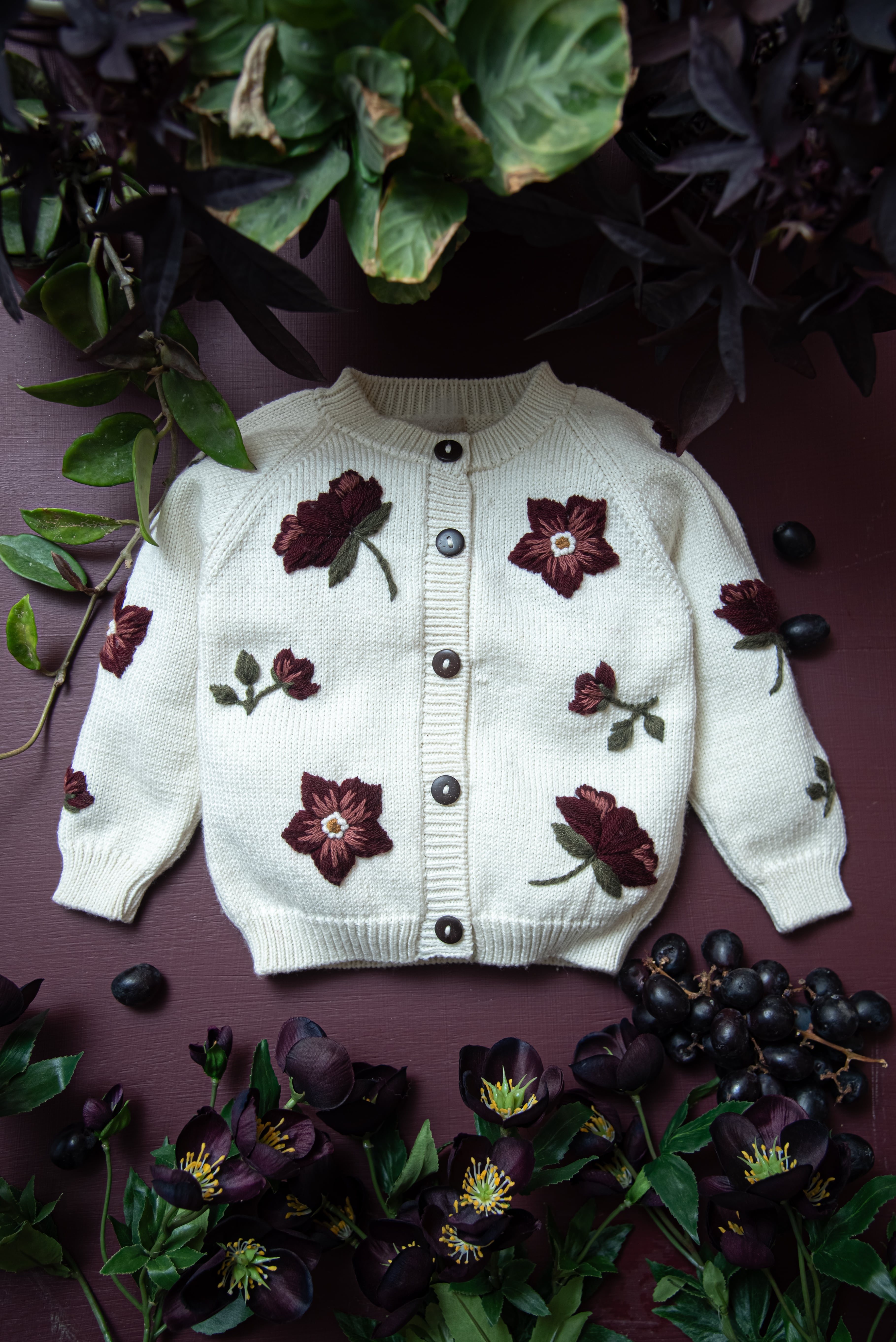 深みのあるボルドーカラーのお花の刺繍を散りばめた